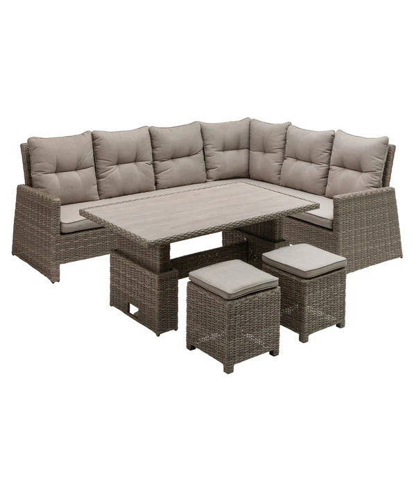 Dass die Dehner Geflechtlounge Bologna eine so immense Ausstrahlung besitzt, liegt an ihrem stilvollen Design. Hier fällt zuerst der Korpus der der Teile ins Auge, bei dem sich das handgefertigte Kunststoffgeflecht großflächig ums stabile Alugestell spannt. Mit seinem lebendigen Farbspiel, das sich wie bei natürlichem Rattan zufällig ergibt, verströmt es ein wunderbares Urlaubsgefühl. Das perfekt durch die hochwertigen Polster im passenden, hellen Farbton komplettiert wird und dank der Punktsteppungen im Rücken noch eleganter und komfortabler wirkt.