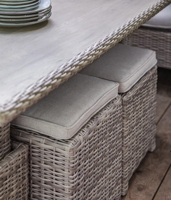 Dass die Dehner Geflechtlounge Bologna Wind und Wetter trotzen kann, liegt natürlich an den verwendeten Materialien und deren hochwertiger Verarbeitung. Dazu gehört ein pulverbeschichtetes und deshalb witterungsbeständiges Alugestell genauso wie das Kunststoffgeflecht, das witterungsbeständig und pflegeleicht ist und Polster, deren Bezüge sogar abgenommen und von Hand gewaschen werden können.