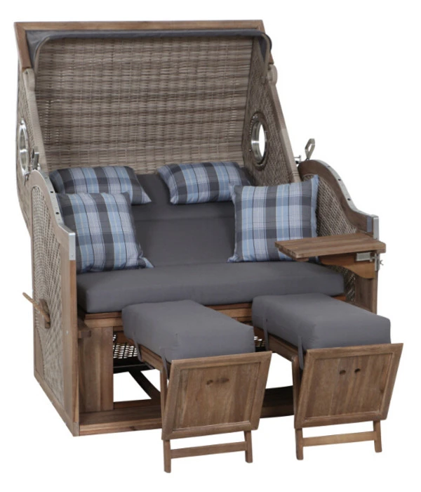 Das stabile Gestell besteht beim Strandkorb Greenline 175 aus FSC®-zertifiziertem Akazienholz, also einem Holz, das von Natur aus perfekt auf ein langes Leben unter freiem Himmel ausgerüstet ist; das Geflecht ist aus ebenfalls wetterfestem Kunststoff. Für die Sitz- und Rückenpolster wie die kleinen Kuschelkissen wurde eine hochwertige, strapazierfähige Polyester-Qualität. Noch ein Pluspunkt: Sie können die Kissen komplett herausnehmen und bei Bedarf waschen.