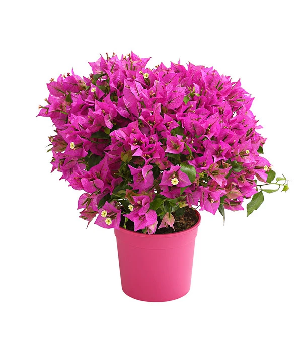 Wohl kaum eine andere Pflanze erinnert so sehr an Urlaub in südlichen Gefilden wie die Bougainvillee. Mit ihren kleinen, weißen Blüten und deren typischen ‚Halskrause‘ aus kräftig gefärbten Hochblättern, zaubert sie im Nu mediterranes Flair auf Balkon und Terrasse. Die Farbenpracht der Drillingsblume, wie sie aufgrund ihrer Blütenform auch genannt wird, zeichnet sich durch die kräftigen pink-violetten Hochblätter aus. Hinter unseren Bougainvilleen steckt die Sorte ‚Sanderiana‘, die eine besondere Leuchtkraft und lang anhaltende Blüte verspricht. Da die Bougainvillee in Brasilien beheimatet ist, bevorzugt sie auch bei uns einen vollsonnigen und warmen Standort, wenn Sie ihr diesen Wunsch erfüllen, taucht die Drillingsblume Ihr Zuhause in ein Meer aus Blüten.