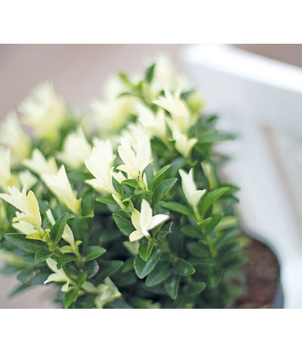 Sie können den Kriech-Spindelstrauch ‚Paloma Blanca‘ aber auch sehr gut als pflegeleichte und immergrüne Balkonkastenbepflanzung einsetzen. Vielleicht zusammen mit andersfarbigen Euonymus-Sorten oder auch mit Efeu, der seine Triebe dann elegant über den Kasten herunterhängen lässt. Und wenn Sie in manchen Jahren mehr Lust auf Farbe haben, setzen Sie zwischen den Kriech-Spindelstrauch ‚Paloma Blanca‘ einfach ein paar schöne Sommerblumen!
