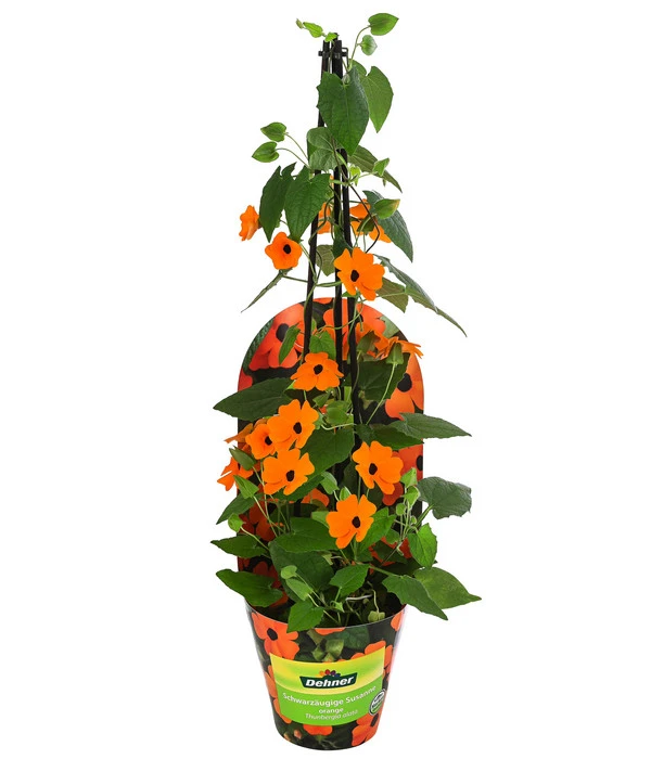 Erst schmückt sie im Frühling ihre rankenden Triebe mit herzförmigen Blättern, dann lässt sie ab Juni zwischen dem Laub unzählige Blüten aufleuchten, die Sie mit der typisch dunklen Mitte wie magische Augen anschauen. Ein Blütenspektakel, das die Schwarzäugige Susanne den ganzen Sommer bis in den Herbst hinein entfaltet. Und als kleiner Trost dafür, dass die frostempfindliche Pflanze bei uns meist nur einen Sommer erlebt, legt sie eine unglaubliche Wuchsfreude an den Tag und klettert mit Leichtigkeit bis in Höhen von 200-300 cm – als Vertreter der sogenannten Linkswinder übrigens gegen den Uhrzeigersinn. Haben Sie schon ein Plätzchen in Ihrer Gartenanlage im Blick, das die Schwarzäugige Susanne mit ihren langen, blütenbesetzen Ranken schmücken darf? Dann setzen Sie sie gleich dort ein und freuen sich auch, dass die Kletterpflanze am richtigen Standort erstaunlich unkompliziert ist.