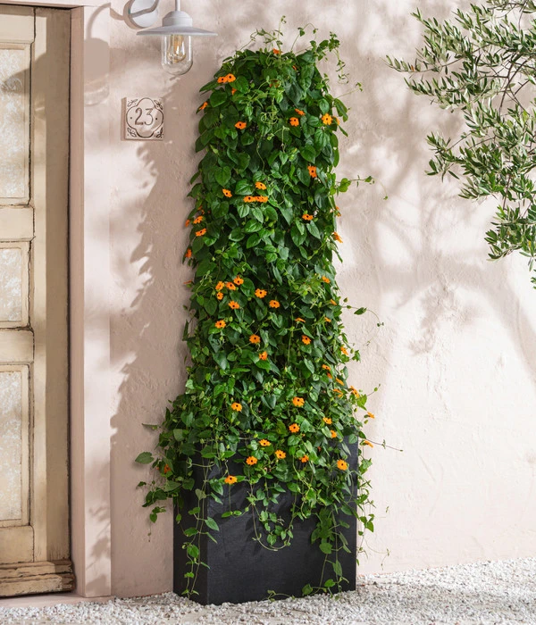 Ob an der Pergola neben der Terrasse, am Zaun zum Nachbargrundstück, an der kahlen Wand der Garage – die Schwarzäugige Susanne klettert flink überall hoch und bedeckt alles mit ihren langen Ranken und dem reichen Blütenflor. Auch auf Balkon und Terrasse bietet sie sommerlichen Sichtschutz in großen Kästen oder Kübeln. Doch die Richtung Ihrer Wuchsfreude ist nicht immer nur nach oben. Ebenso gerne und elegant lässt sie ihre prächtigen Ranken auch aus einem Balkonkasten oder einer Ampel nach unten fallen.
