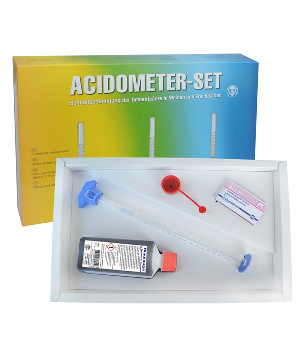 Das Komplettset zur Bestimmung des Säuregehaltes in Weinen oder Säften. Das Acidometer-Set besteht aus einem Säuremesszylinder, 250 ml Blaulauge, Tropfverschluss und Lackmuspapier – damit haben Sie das vollständige Wein-Zubehör, das Sie zur präzisen Bestimmung des Säuregehaltes benötigen. Mit genauer Verwendungsanleitung.
