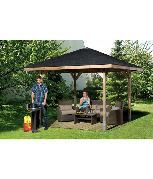 4-Eck Gartenoase 651 mit naturbelassenem 19 mm Massivholzdach, ohne Boden, Konstruktionshölzer kesseldruckimprägniert